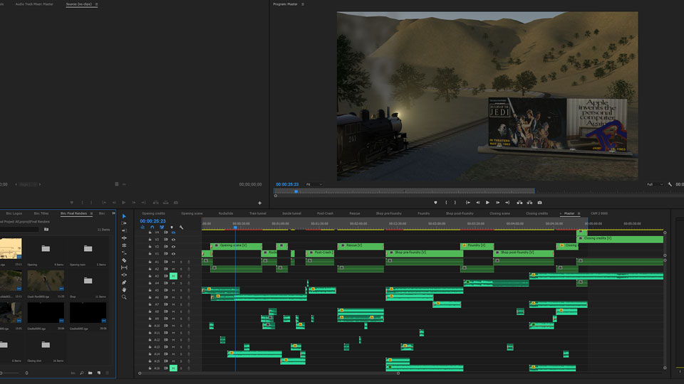 For this project we used Adobe Premiere to do the video editing as well as Adobe After Effects to do the special effects such as smoke and sparks. Adobe After Effects utilized the Compositor link from 3DS max to make the positioning of effects easier (some still had to be key-framed manually). The picture above is the timeline of our video in Adobe Premiere at ~90% completion of the project. It might look like chaos, but this is normal for video editing.
