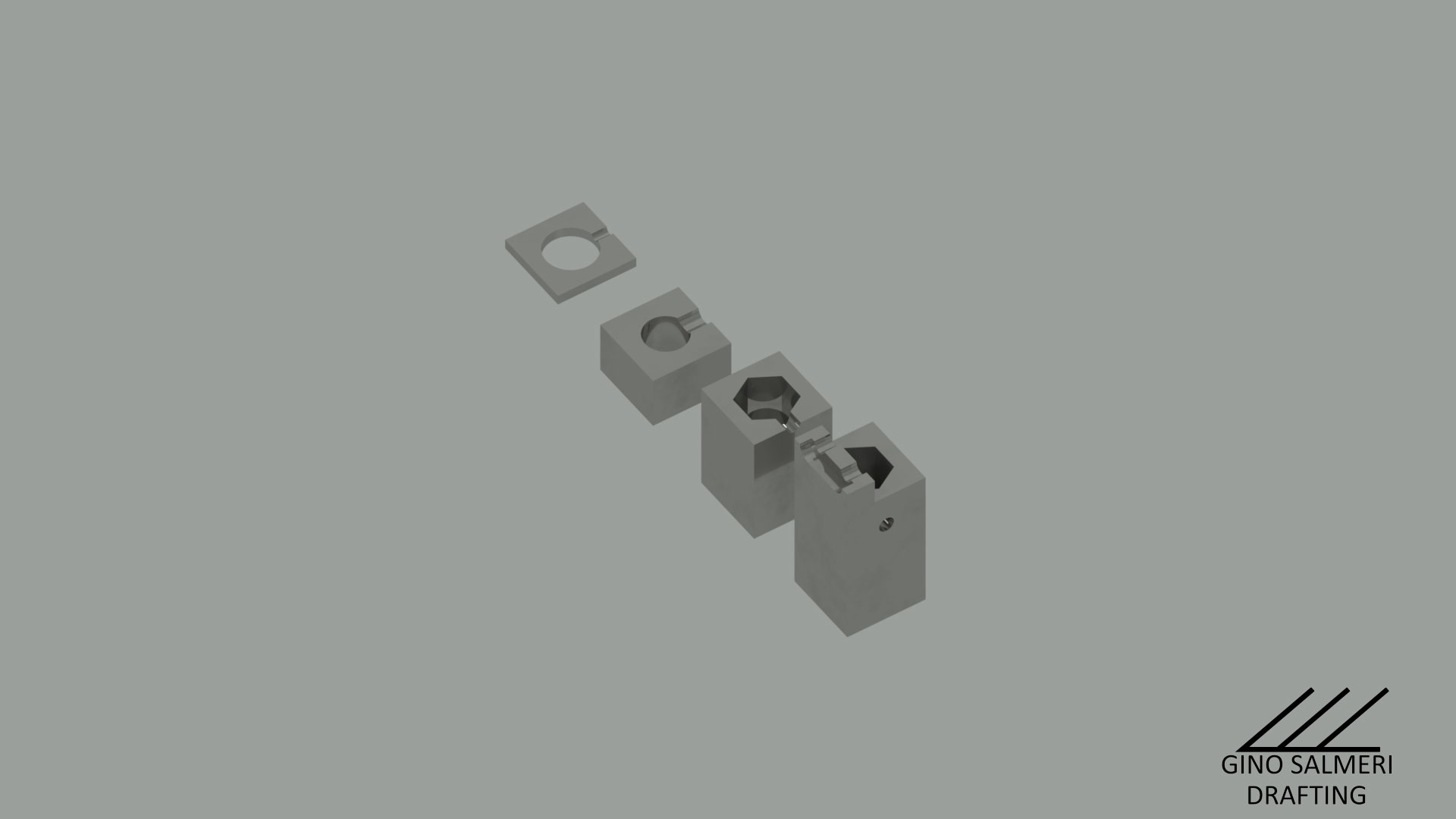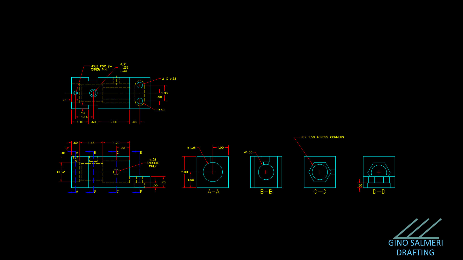 Casing A project completed in AutoCAD in which I created alternate views of the given working drawing to create a 3d model and modeling the section views as well. The first image is that of the whole casing modeled in 3d. The second image is the sketch plane in which I sectioned the original part to then dimension the features present in the section. The last image is those sectioned parts rendered in 3d to show the features present throughout the casing.