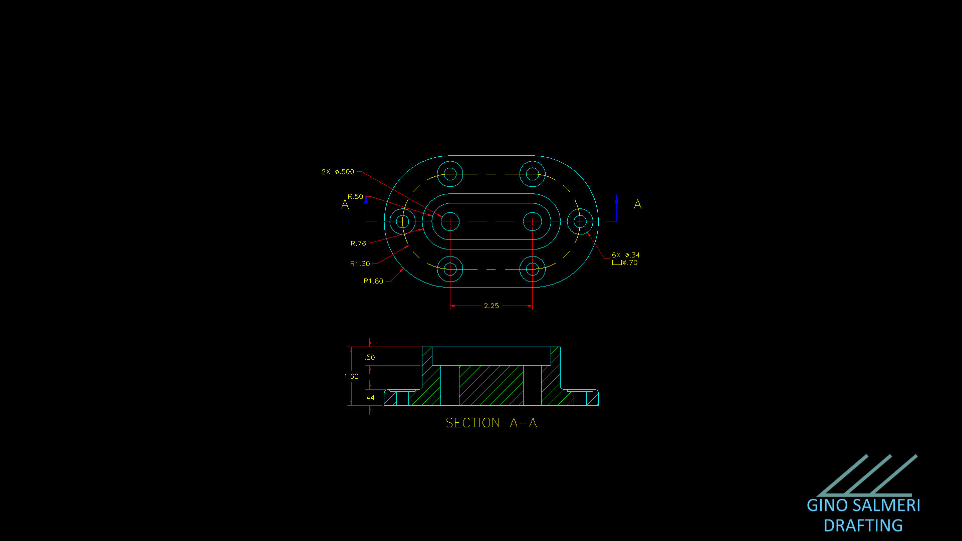 Shaft Base Shaft Base started off as a working drawing that I turned into 2d dimensioned sketch. The first image is the full shaft base with different materials applied and rendered in a 3d enviornment. The second image is of the 2d dimensioned sketch that allowed me to create the 3d model. The last image is of the shaft base sectioned in 3d, exposing the internal features.