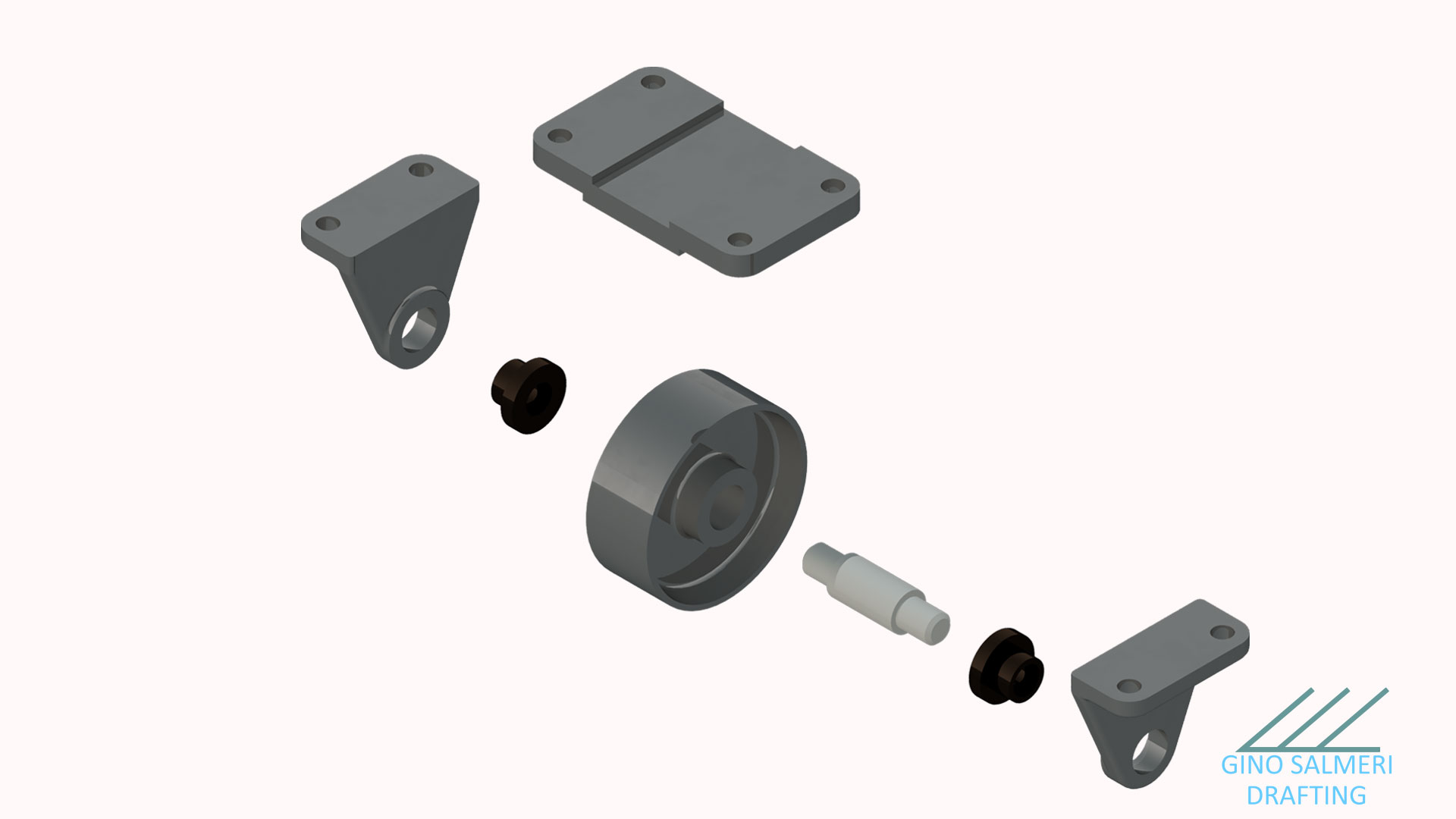 Wheel Assembly The Wheel Assembly project was completed using Inventor Professional. This project was to construct the wheel assembly from a working drawing and then modeling it in 3d. The first image is the final assmebly put together. The second image is the drawing with dimensions placed for all included parts. The third image is an exploded view showing all parts included in 3d of the wheel assembly.