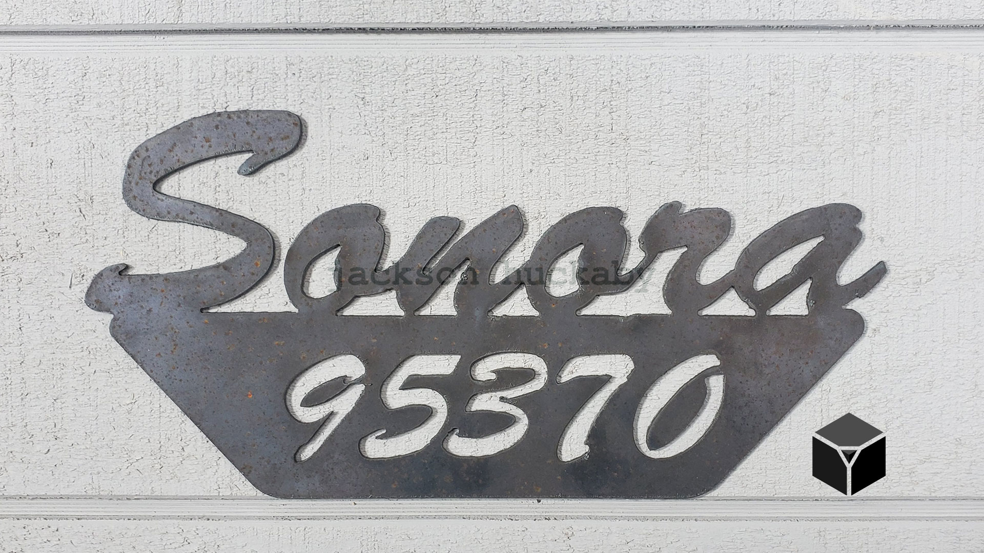 This sign was designed by me using Adobe Illustrator, then exported to a software called Sheetcam to translate the contours into instructions for a computer-controlled plasma cutter in order to cut the signs out of sheet metal. Hover over the image with your mouse to see the design brought to the real world.