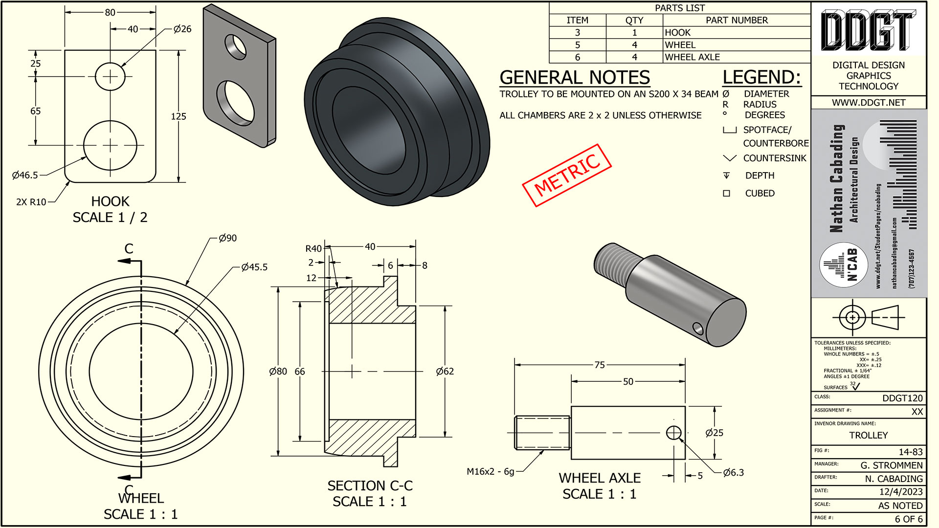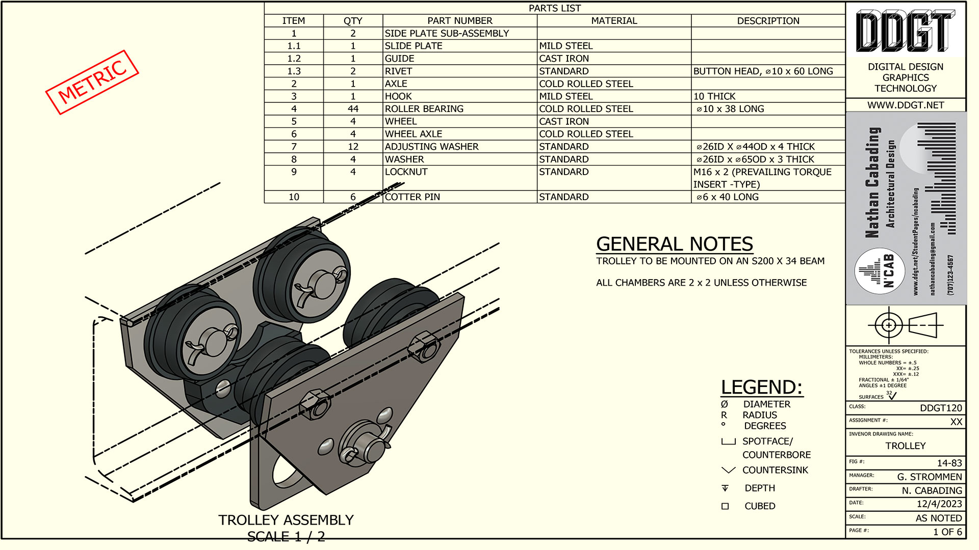 This is the 14-83 Trolley Assignment that was completed in Inventor. This assignment contains multiple parts that creates one big assembly. This was one of the more challenging assignments due to how organized the multiple parts have to be to make it a working drawing. This assignment taught me how to be patient with myself and to be resourceful. |