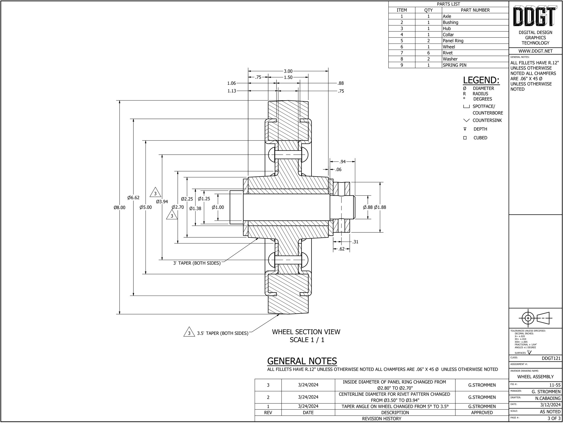Wheel Assembly (Inventor) This is the Wheel Assembly that I made in Inventor. This was a fun Assignment that acquires multiple parts to create the main assembly. This assignment taught me how to be precised and organized. The 2D drawing contains mostly revolutions to create the 3D parts you see now.