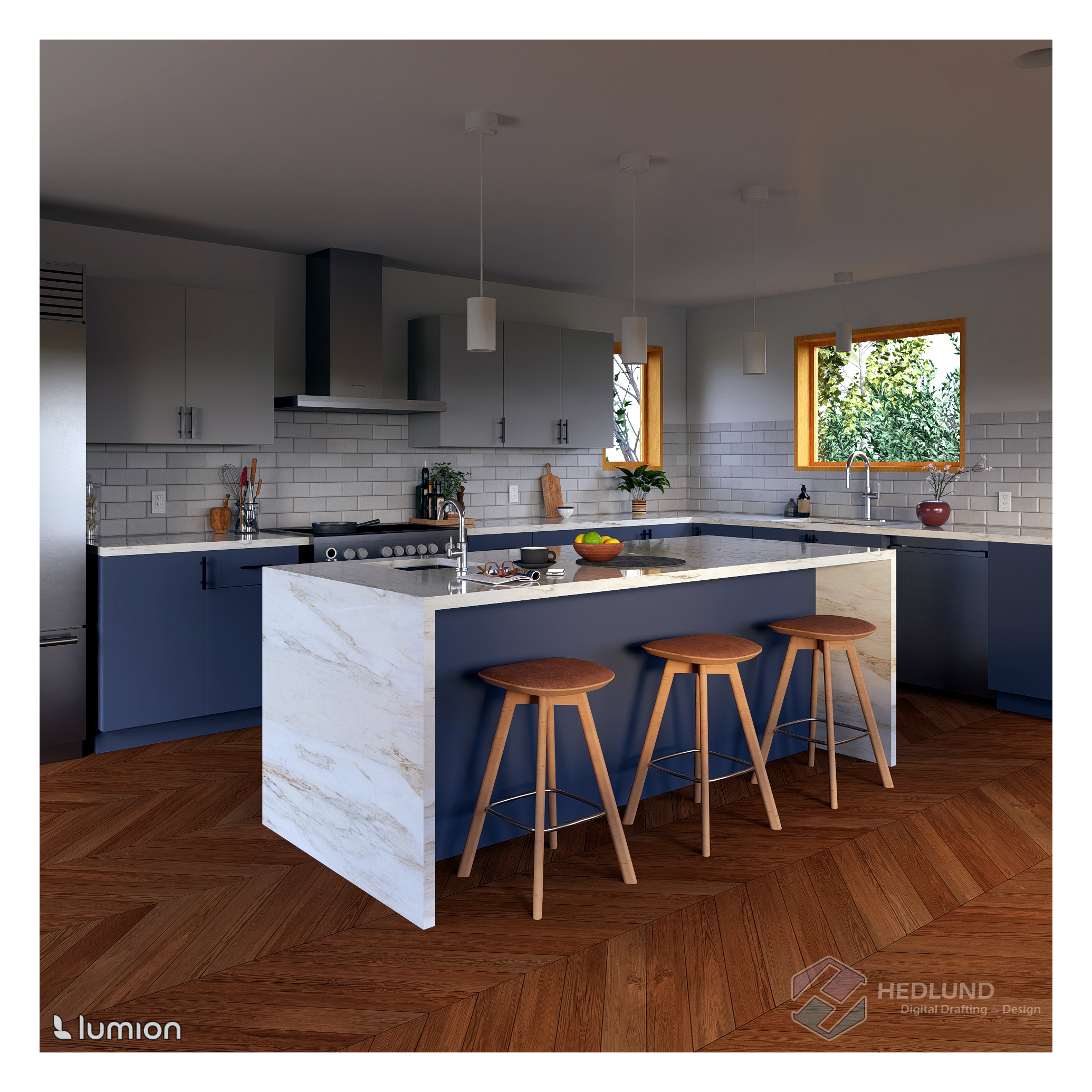 I designed and constructed parametric cabinet families in Revit and used them to design the following kitchen concepts. Renders were completed in Lumion. Edited using Adobe Photoshop.