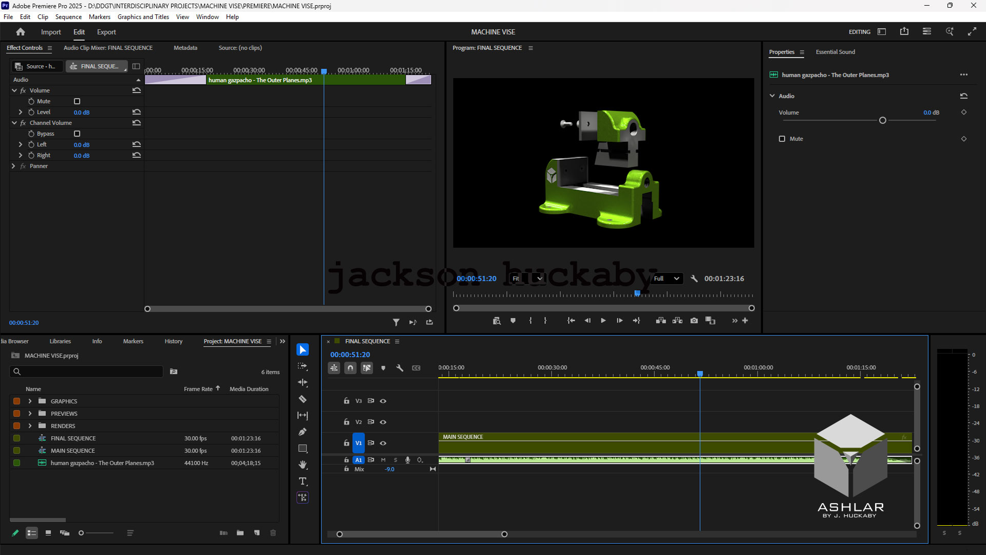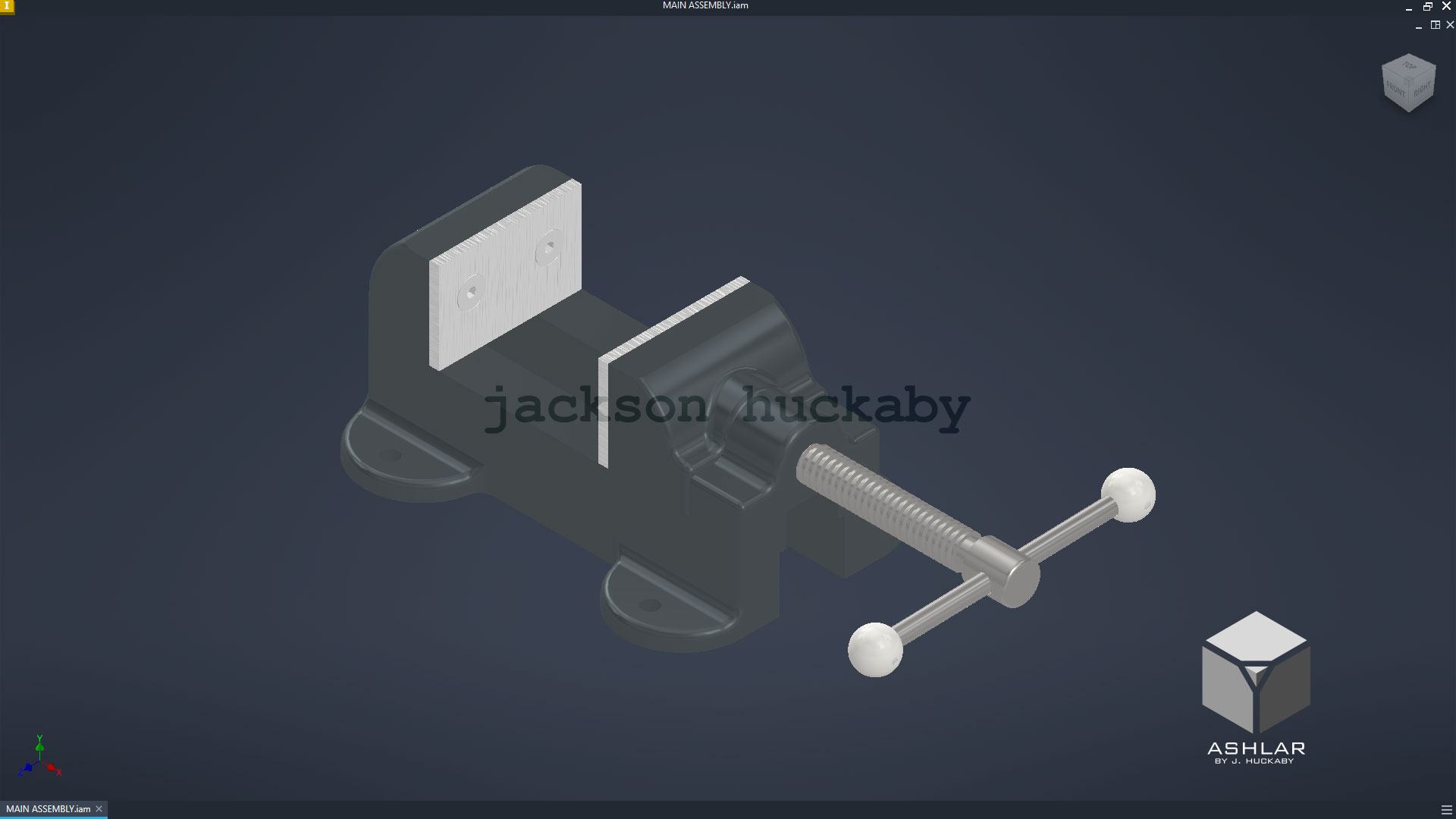 In the Fall 2025 semester, one of the main projects was to model the parts of a machine vise in Autodesk Inventor based on a condensed hand-drawn original drawing, then creating a new working drawing set (drawings detailing the necessary features of the part for reproduction) from the modeled parts(see them here). After modeling the parts and creating the drawing, I added a woorkbench surface and mounting bolts for a beauty shot in the next step: animation in Autodesk 3D Studio Max. In 3D studio Max, I imported the model I had made from Inventor and added special material effects to the parts to make them look closer to how they may look in real life. After adding materials, I then added lighting to help give some life to the assembly's parts. I planned and animated the camera and part movements for each step of the assembly, creating half-sectioned versions of select parts to allow for better viewing of some parts of the assembly. Once the planning was done, I started the process for rendering the frames of the animation, using 3D Studio Max from the Windows command line to render the individual scenes in sequence with a custom batch script. Once the individual frames were all done being rendered, I moved on to using Adobe Premiere Pro to stitch the frames together into video footage, adding appropriate transitions between the individual scenes, title cards made in Photoshop, and music sourced from the Free Music Archive to break the uncomfortable silence.